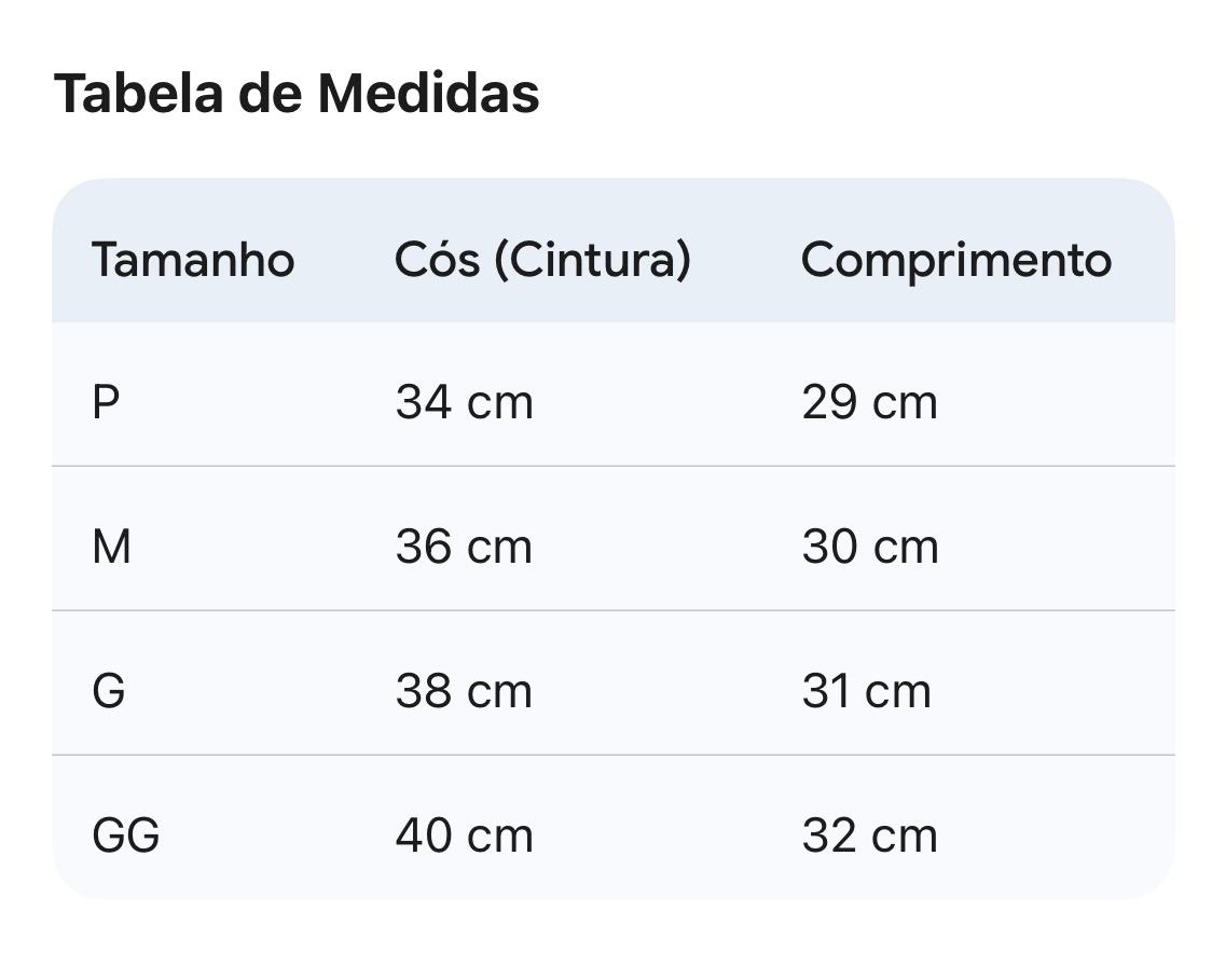 Confira abaixo as dimensões para escolher o tamanho ideal (medidas aproximadas):